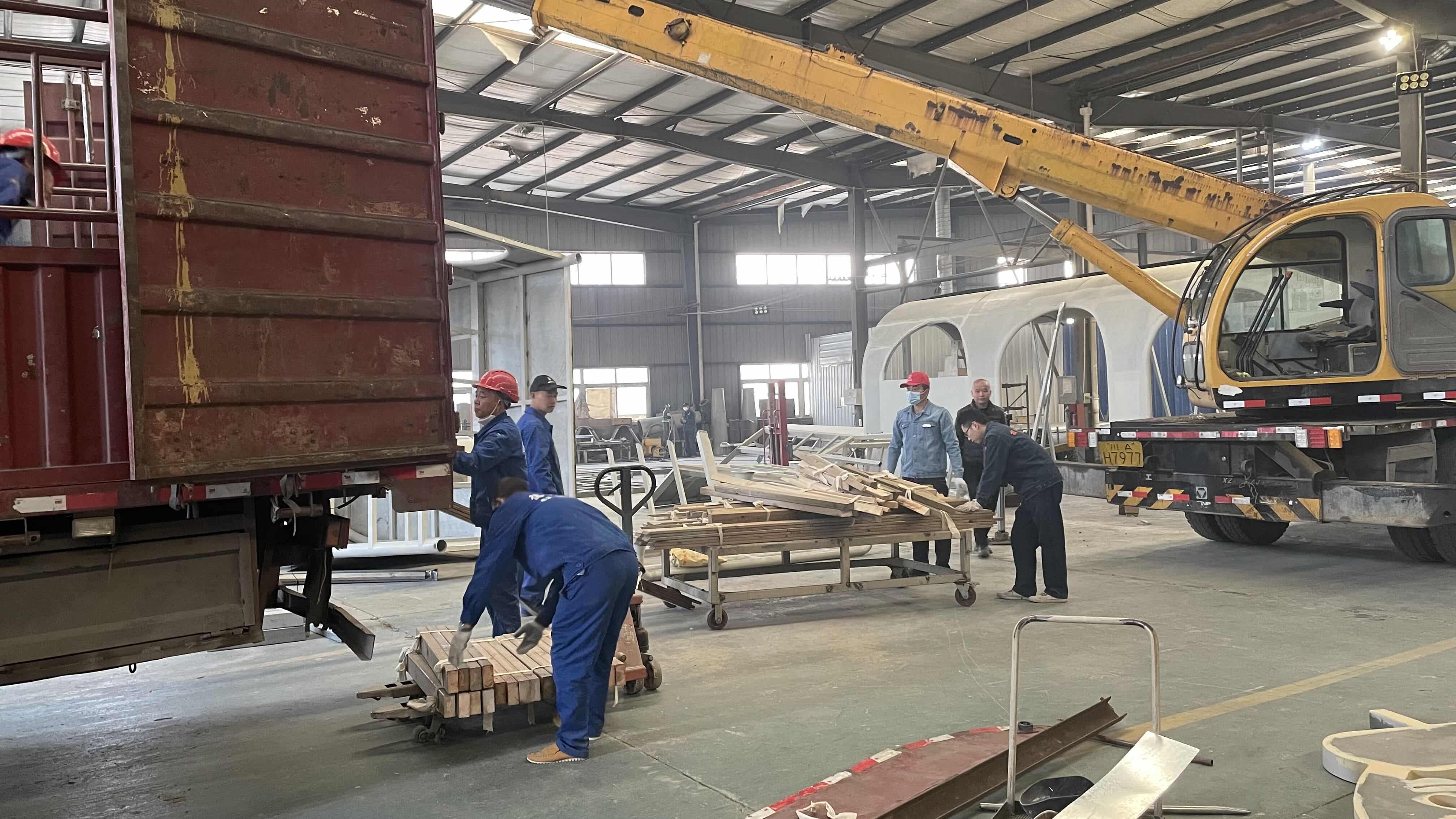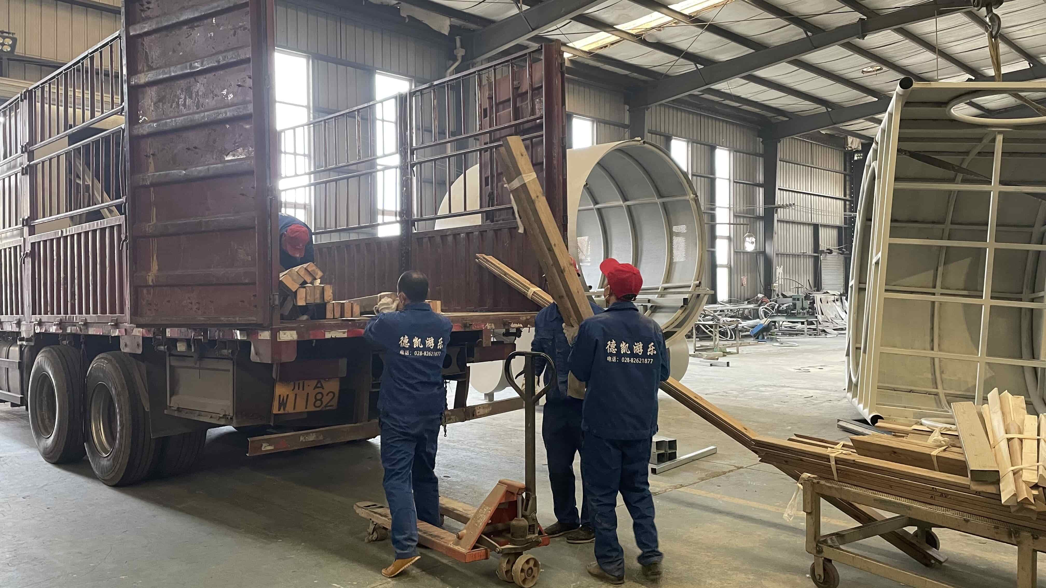 火山火車主題樂園部分設(shè)施開始出庫,運(yùn)輸?shù)侥康牡亻_始安裝。