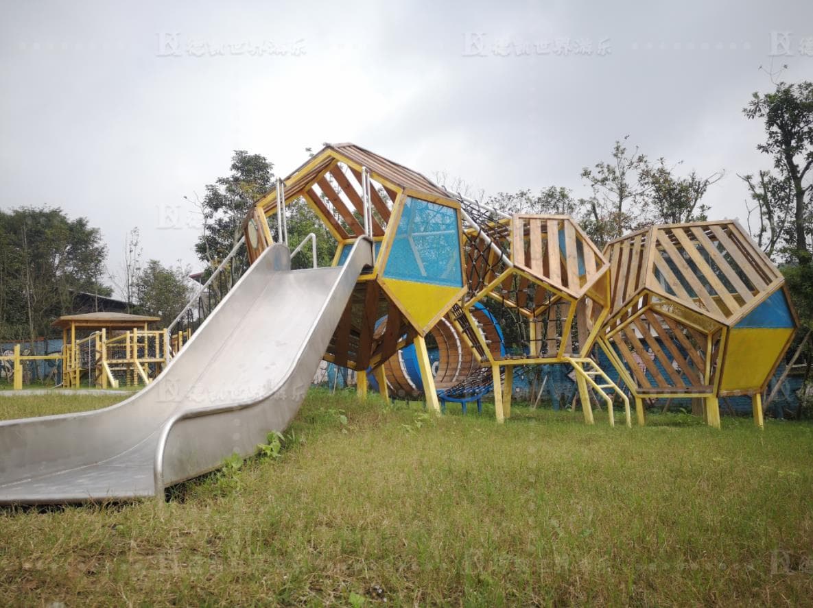 這個游樂項目把攀爬網和高空旋轉滑梯組合在一起,迎合了孩子們愛探險的天性,高處是一個由玻璃制作而成的區域,能讓孩子們體驗到站在高空中的刺激感,高空旋轉滑梯帶孩子們感受冒險的快樂。
